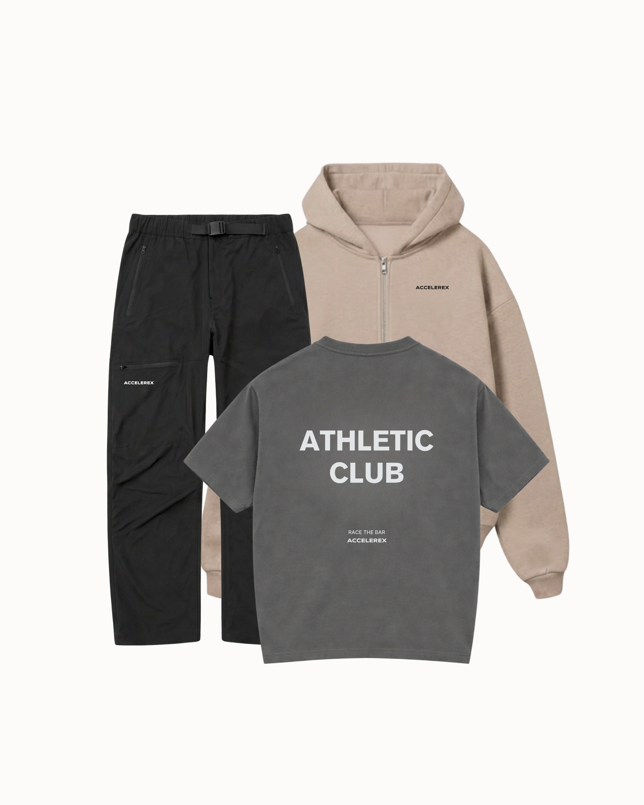 HIKE PANTS, BEIGE ZIP HOODIE, GREY TEE